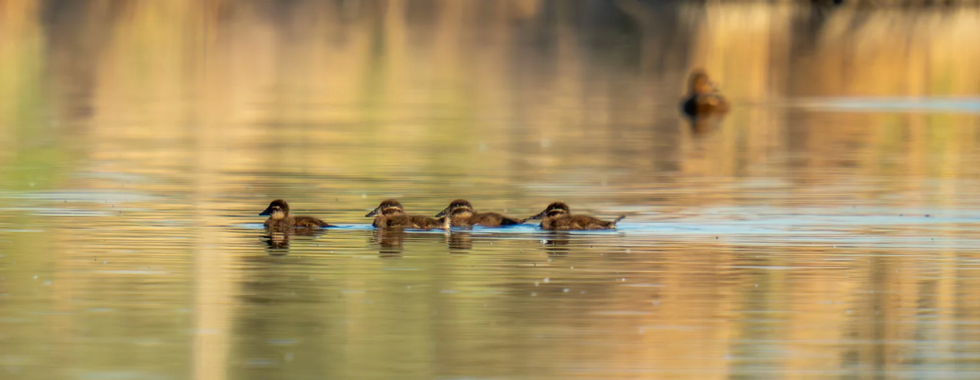 Unmistakably, it has a bright white head, with a thick sky-blue bill and a chestnut-brown body shimmering under the soft sunlight. It looked a bit like Donald Duck! Every time it disappeared beneath the surface to catch fish, tiny ripples spread across the lake. After a while, it popped up again with fish in its beak. Nearby, the female duck took care of the 4 ducklings. The female, Daisey, and the ducklings had a more grayish color, with a dark stripe across their faces, elegantly swimming.